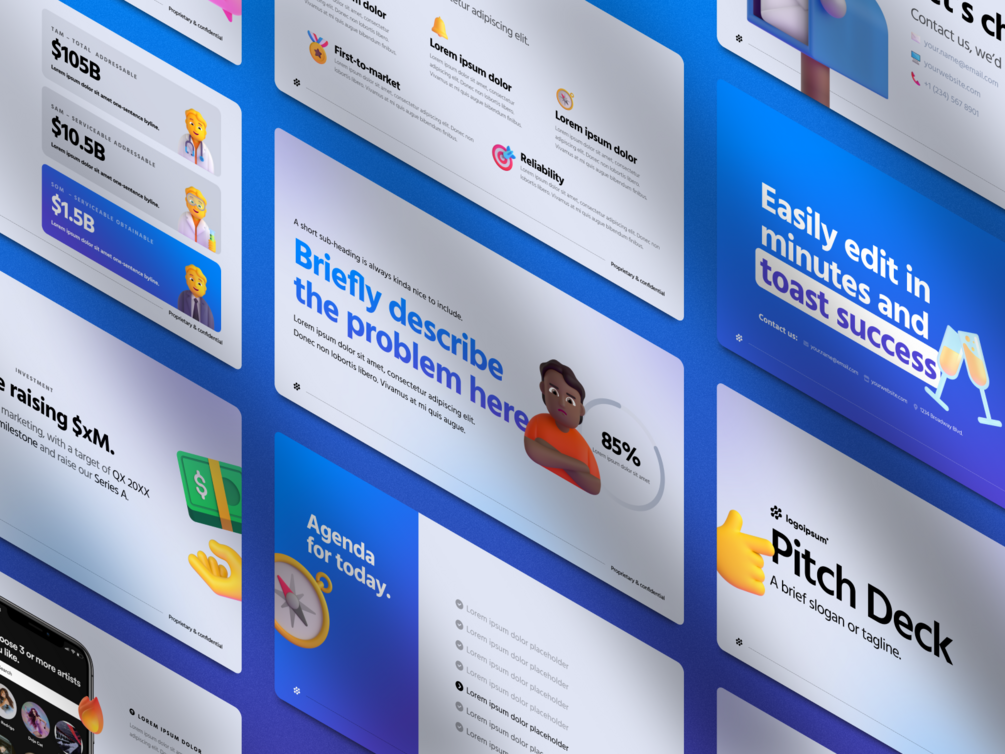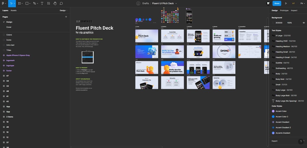 Use these meticulously crafted slides to create a striking presentation, inspired by Microsoft's new Fluent UI emoji kit. Thanks to the Fluent Pitch Deck by VIP Graphics, startups can secure funding and deals without wasting time or money on expensive presentation design. You'll be closing deals faster than ever with this Figma template: from investor presentations to marketing & sales pitches, present like a pro!