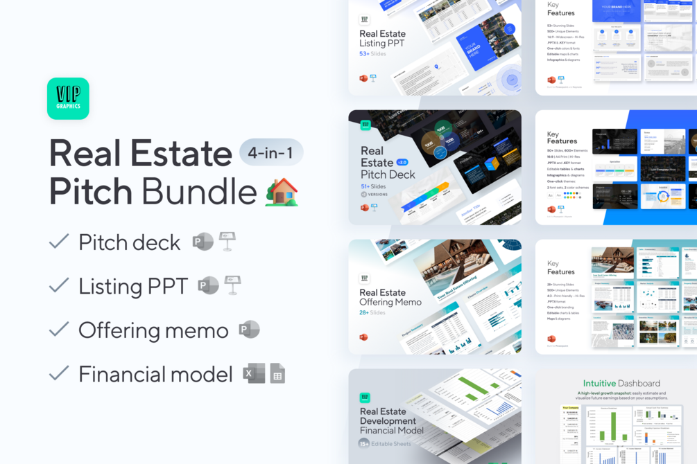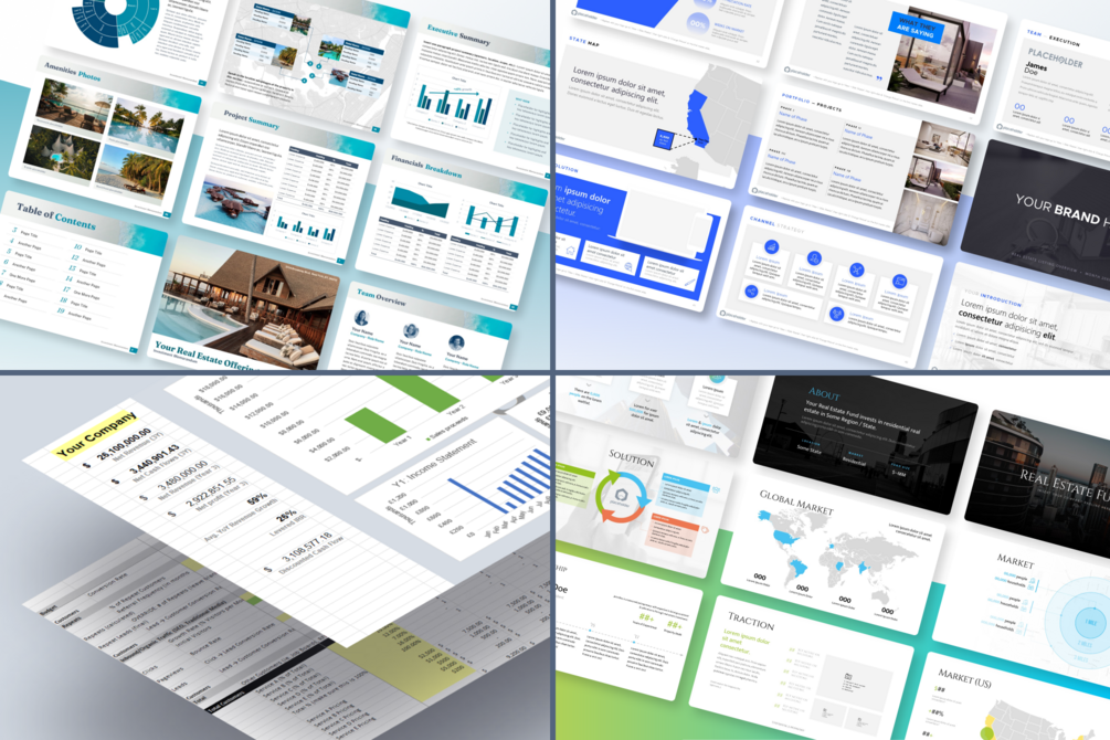 This 4-in-1 bundle offers a combination of our most popular templates, all designed specifically for real estate investors & developers. All the templates ($142+ value) are easily editable in PowerPoint & Excel, available here at nearly half-price! Download this robust toolkit to jumpstart your real estate firm.