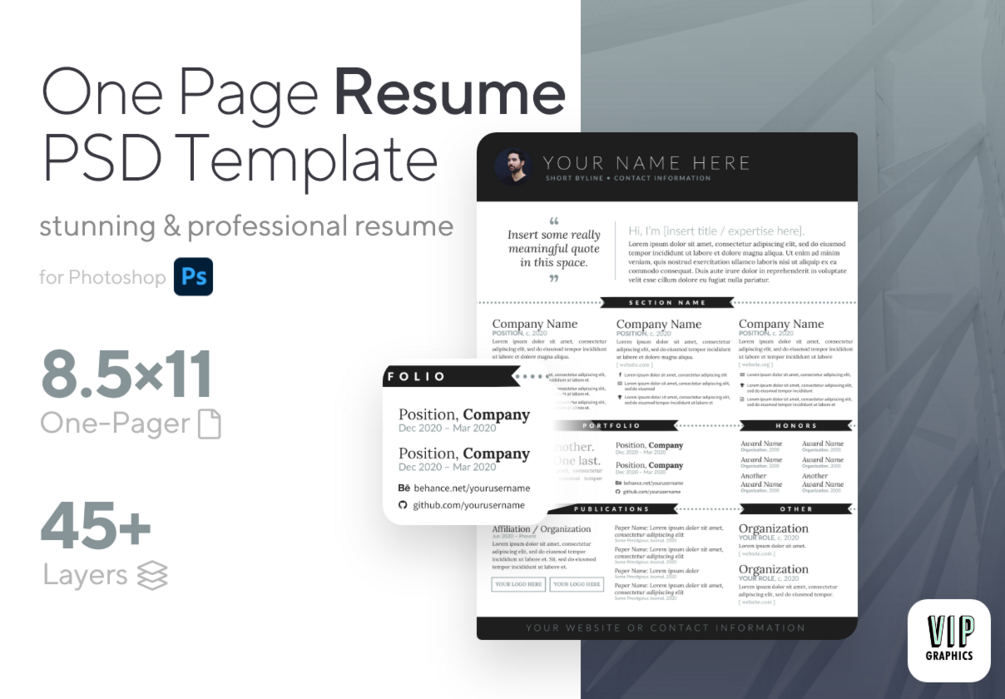 This one-pager Resume template for Photoshop is the perfect solution to put together an eye-catching resume & make the best impression on future employers, clients, and opportunities!
