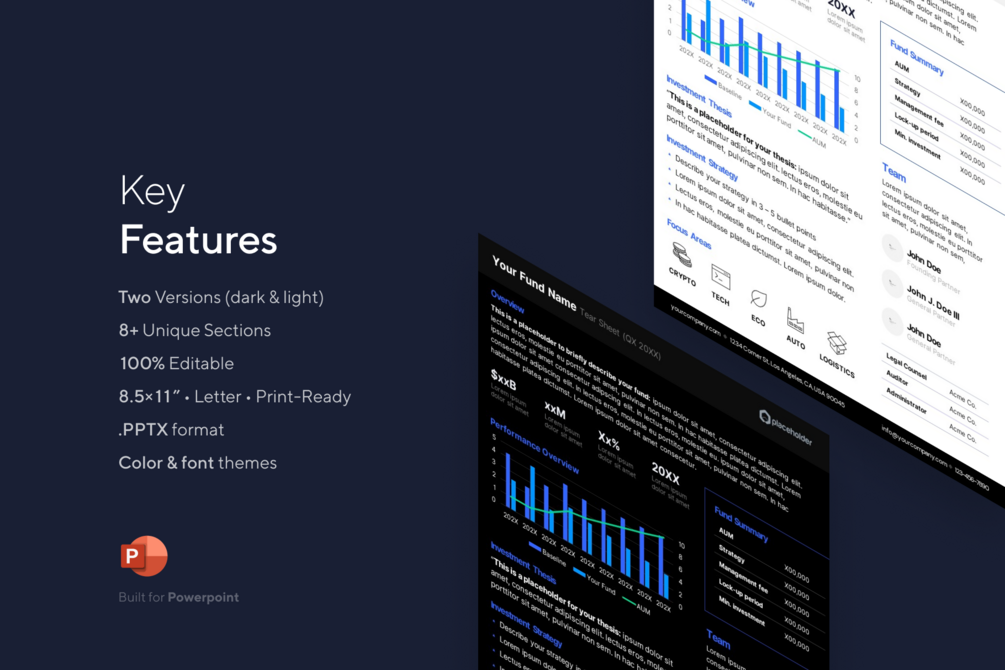 Don’t overcomplicate your next quarterly update: with this PowerPoint template, you can design a professional-grade tear sheet for your fund in minutes.