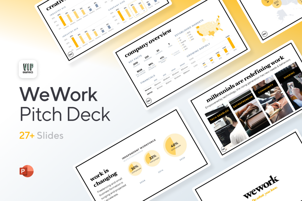 Nevertheless, founders can learn valuable lessons from the early example of WeWork: in particular, the company released a copy of the 2014 pitch deck which helped them close a $355M Series D round (at a $5B valuation) in funding from leading investors like Goldman Sachs, JP Morgan Chase, Benchmark Capital & Harvard Management. We’ve redesigned the original pitch deck as a modern PowerPoint template, but you can find the original version here.