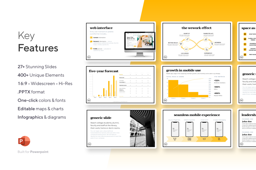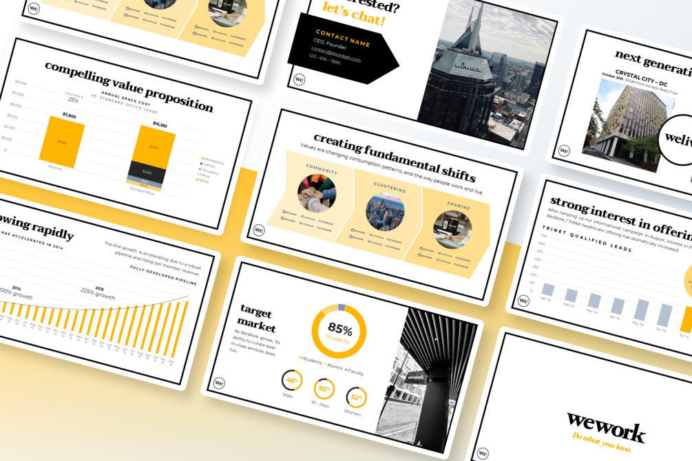 This adapted version of the WeWork Pitch Deck template was crafted for founders seeking to win late-stage funding from venture capital firms and financial institutions. Our team of experts added a professional design touch to the WeWork pitch deck, while preserving their approach and style guide.