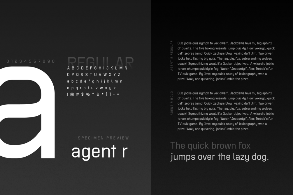 Agent R is a geometric sans-serif typeface that adds a futuristic, cutting-edge look to any design. This minimalist but unique font is defined by its accentuated edges and curves — optimized for legibility at all sizes. Agent R is the perfect font for a wide variety of applications: from posters and HUD interfaces to website and presentations.