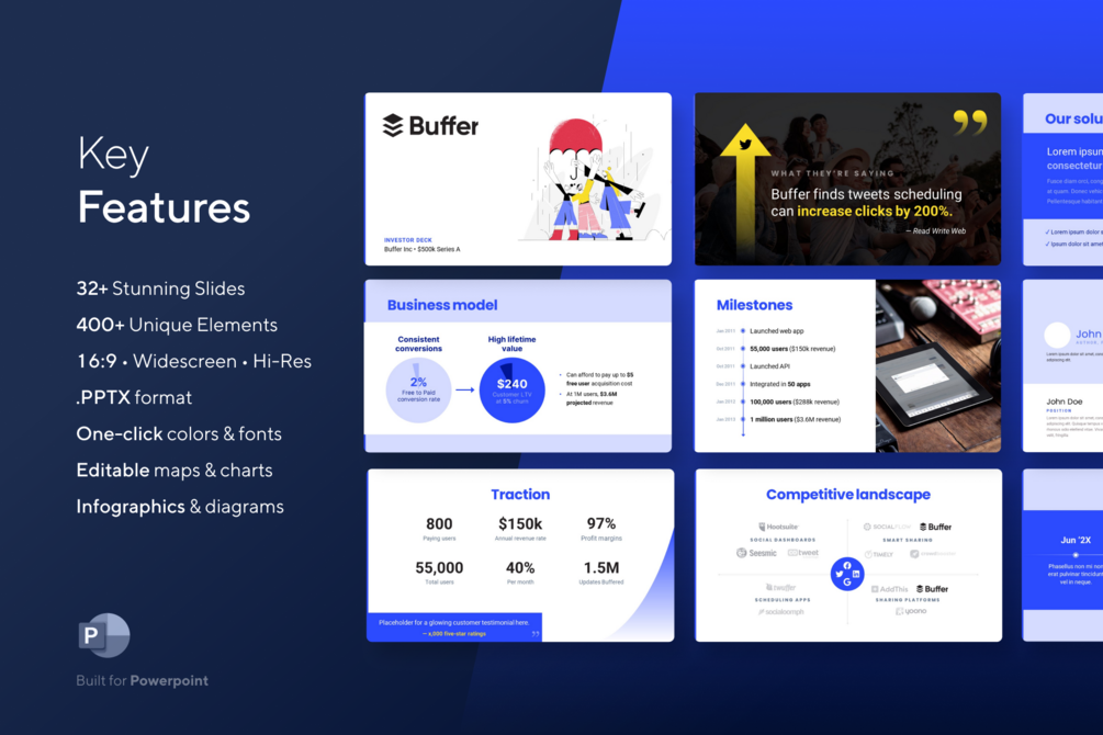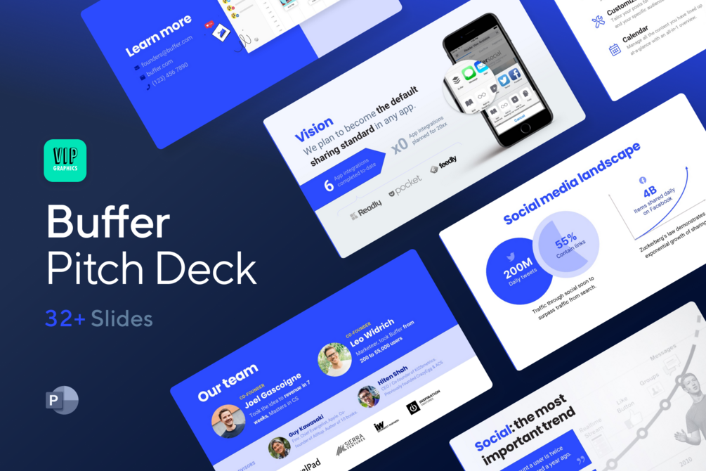 We’ve redesigned the original Buffer pitch deck as a modern PowerPoint template, but you can find the original version here. This adapted version of the Buffer Pitch Deck template was crafted for founders seeking to win early-stage seed and pre-seed funding from the likes of angel investors, venture capital firms and accelerator programs. Our team of experts added a professional design touch to the Buffer pitch deck, while preserving their signature approach.