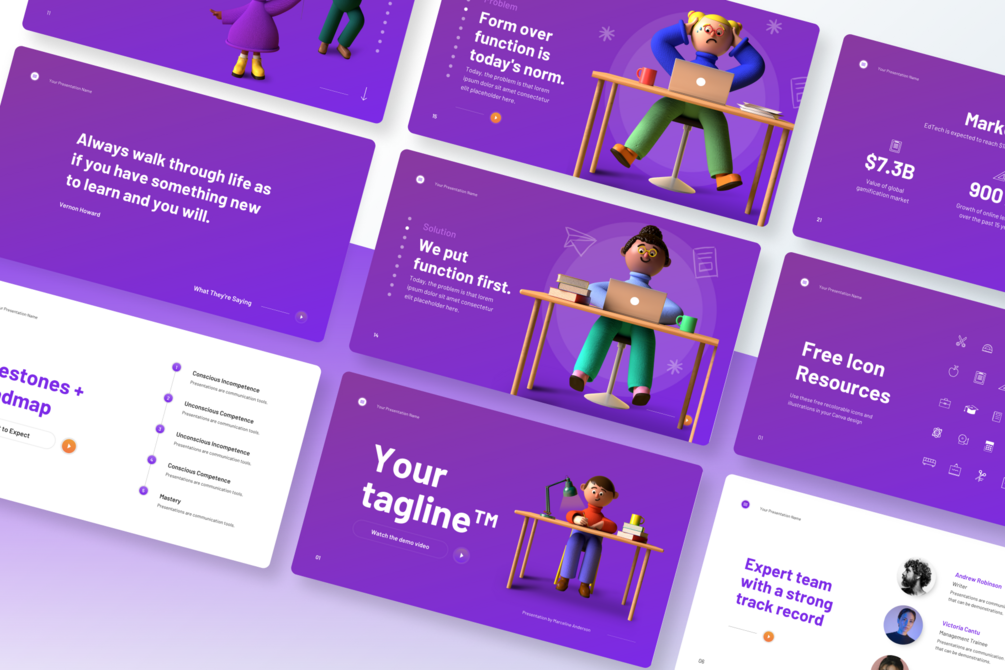 Download this 100%-customizable, expert-designed pitch deck template, built for Canva. Design a stunning presentation with these meticulously crafted slides, with sleek animations and 3D artwork built-in.