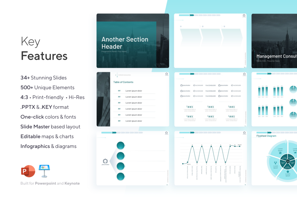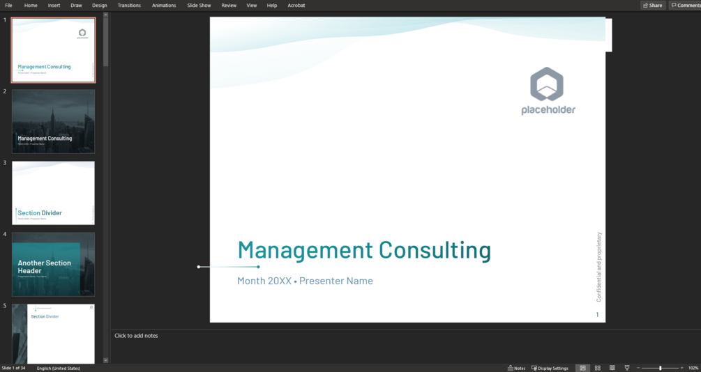 Most all the unique layouts in this template are built in Slide Master, so you can easily create new slides and extend the theme. Management consultant presentations requires a different level of detail and a highly-organized slide format — this template was crafted to give you the tools to nail your next presentation: smart, actionable slides that work.