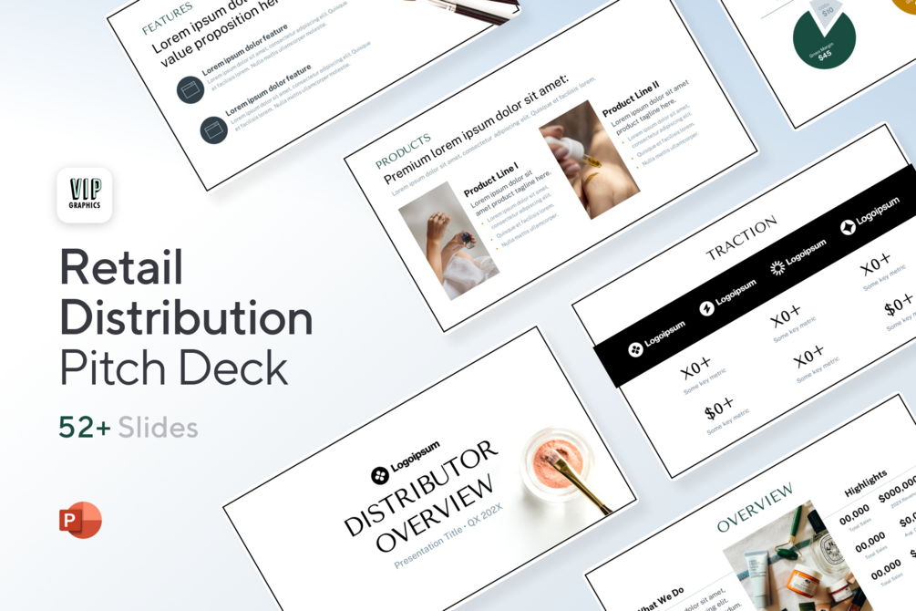 The Retail Distribution Pitch Deck template is ideal for CPG brands seeking to get their products on the shelves of big-box retailers and leading distributors: