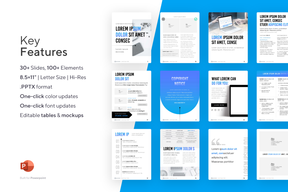 This eBook template includes 30 editable Letter-sized PowerPoint slides, including multiple pre-formatted options for table of contents, title and chapter pages. The entire presentation is based off a slide master layout, so you can easily extend the layouts even without duplicating. Easily customize the background, font color & size on every slide master to create endless design possibilities.