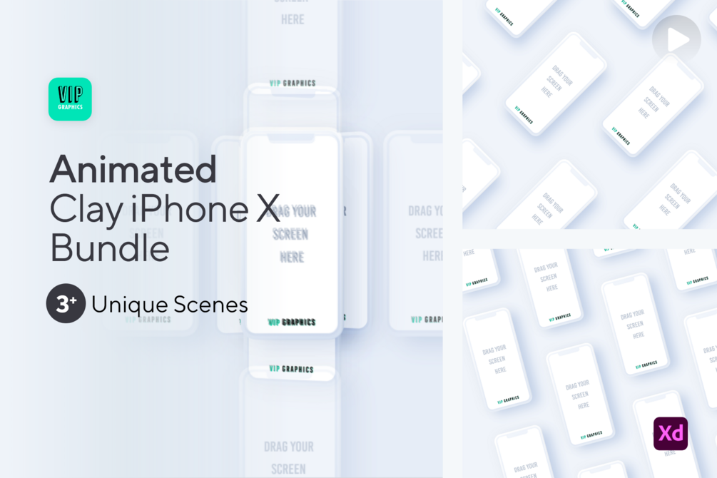 Animated Mockup Bundle (.XD) - Mobile App - Clay iPhones