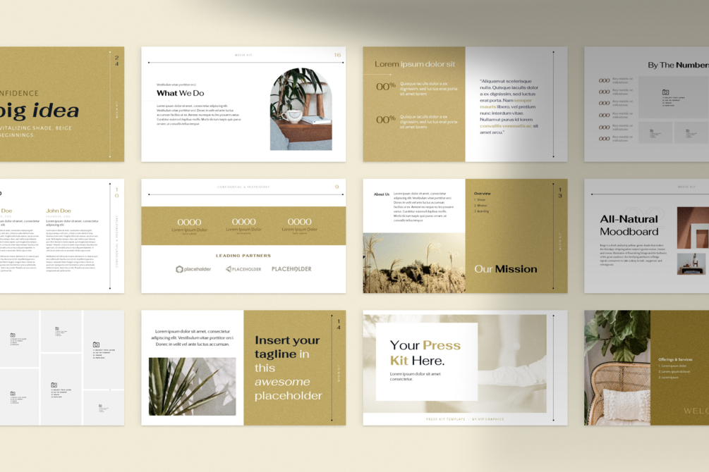 A professional, clean, cutting-edge, and modern template for a media kit / press pack. This unique design can be used to effectively present your project or product in an eye-catching and visually appealing manner. All elements are organized and fully-editable: created for editing in PowerPoint — no complicated / extra software (ie. InDesign, Photoshop) required.