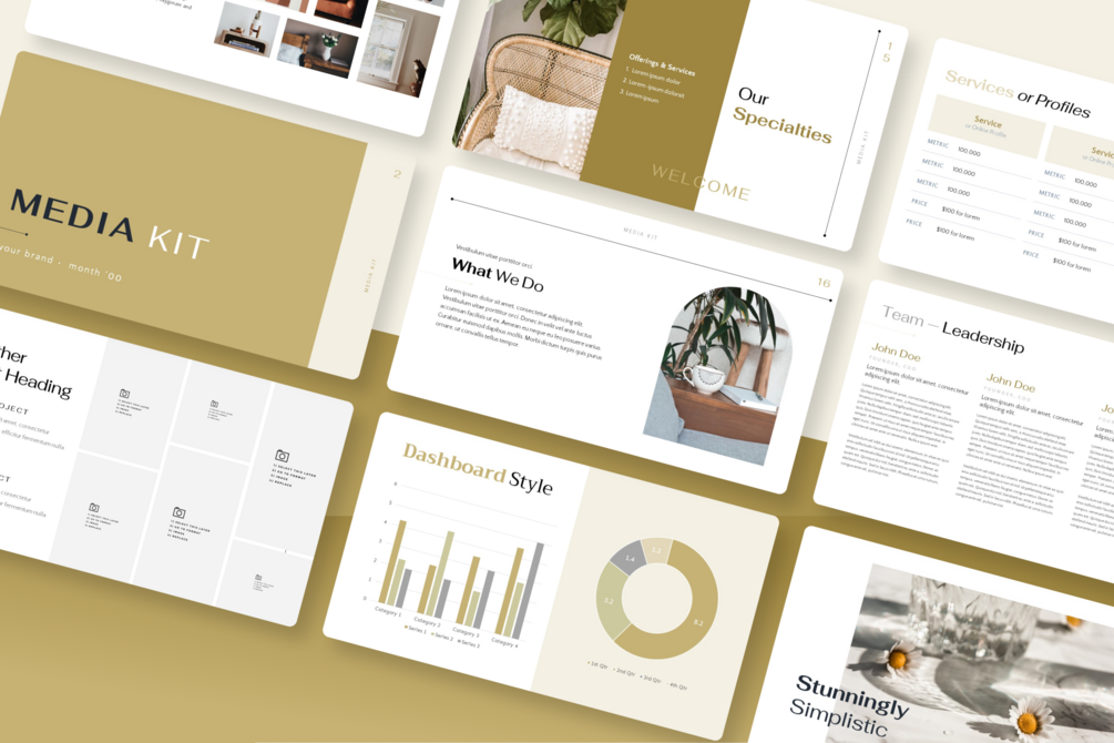 The creative concept for this media kit was to design it with a minimalistic yet classic look and feel. That said, you can easily update the colors & fonts in one-click to match your brand guidelines with PowerPoint themes. With clean graphics and eye-catching slides, this template is a great choice for your next project, portfolio or advertising needs.