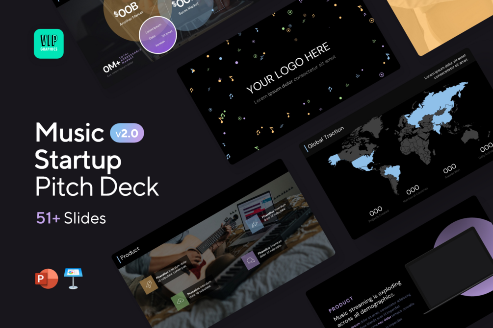 Present the next big deal in Music and Technology with the Music Pitch Deck template for PowerPoint & Keynote. Use this template for mobile apps, music technology and the arts, podcasting and more!