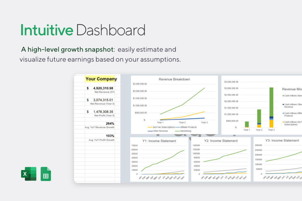 - One high-level summary sheet with 5+ charts & key metric highlights for an immediate & straightforward overview of overall growth