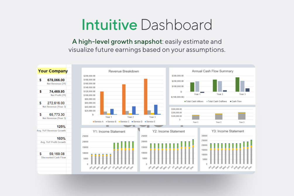 - One high-level summary sheet with 5+ charts & key metric highlights for an immediate & straightforward overview of overall growth