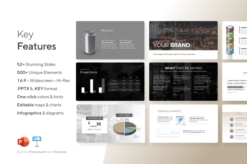 This PowerPoint & Keynote template can help you plan your business and pitch it to investors and/or distributors. With 50+ restaurant & beverage-specific pages included, every slide of this template focuses on the key topics that every new restaurant or spirits business should address in order to succeed.